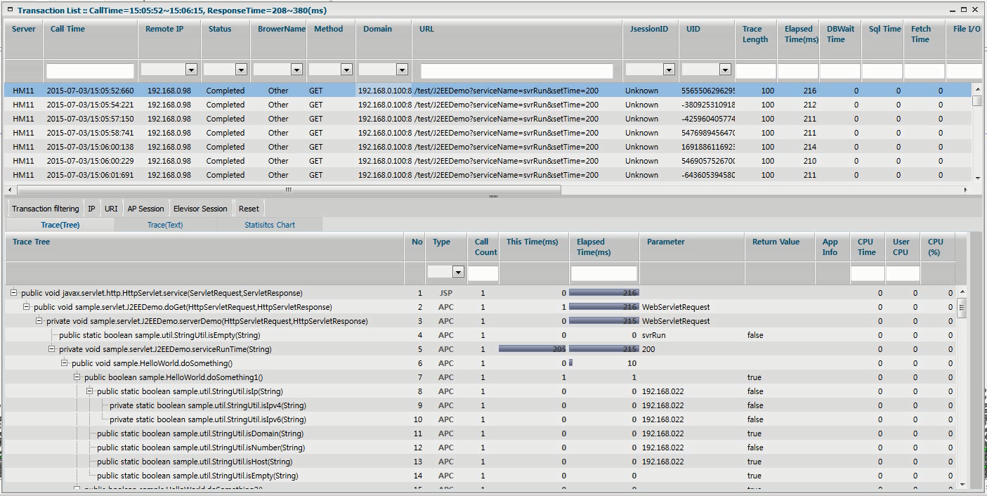 엘리바이저 솔루션은 클라이언트의 웹브라우저부터 Web, WAS, DB, BackEnd에 이르기까지 모든 구간에 대한 각각의 응답 시간을 모니터링합니다.